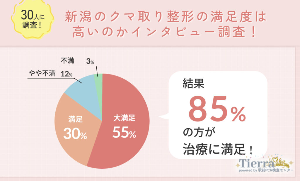 新潟のクマ取り整形のアンケート調査の結果、85%の方が「施術に満足した」と回答していることが分かりました。