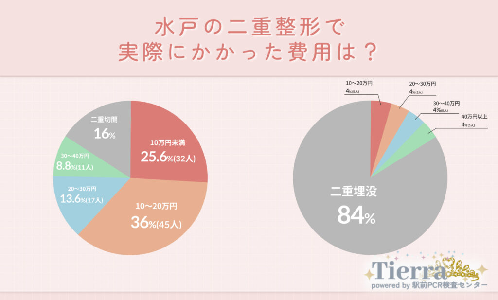 茨城県水戸市で二重整形を受けた125人を対象に費用に関するアンケートを実施した結果、84%が「二重埋没」を選び、最も多かった費用帯は「10~20万円」(40%)でした。