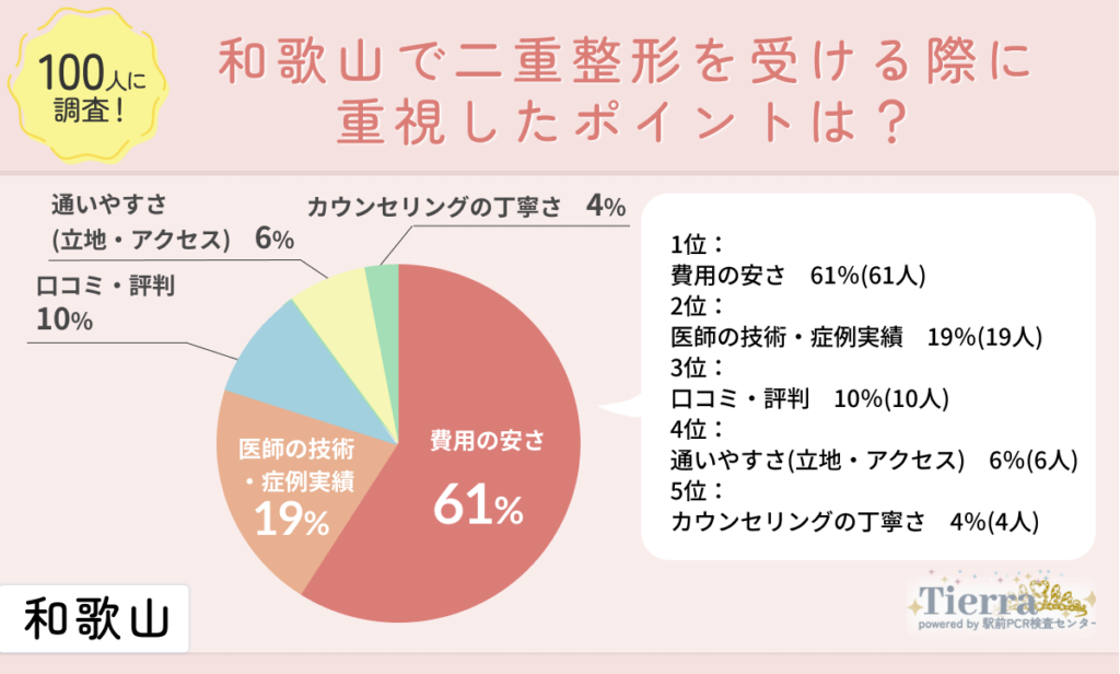 和歌山で二重整形を受けた100人を対象にアンケートを実施した結果「費用の安さ」が最も重視されており、全体の6割以上がコストを最優先に考えていることが明らかになりました。